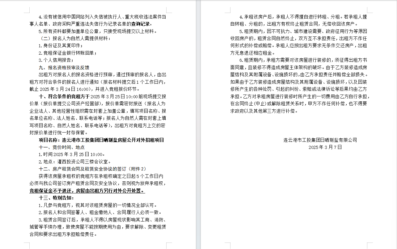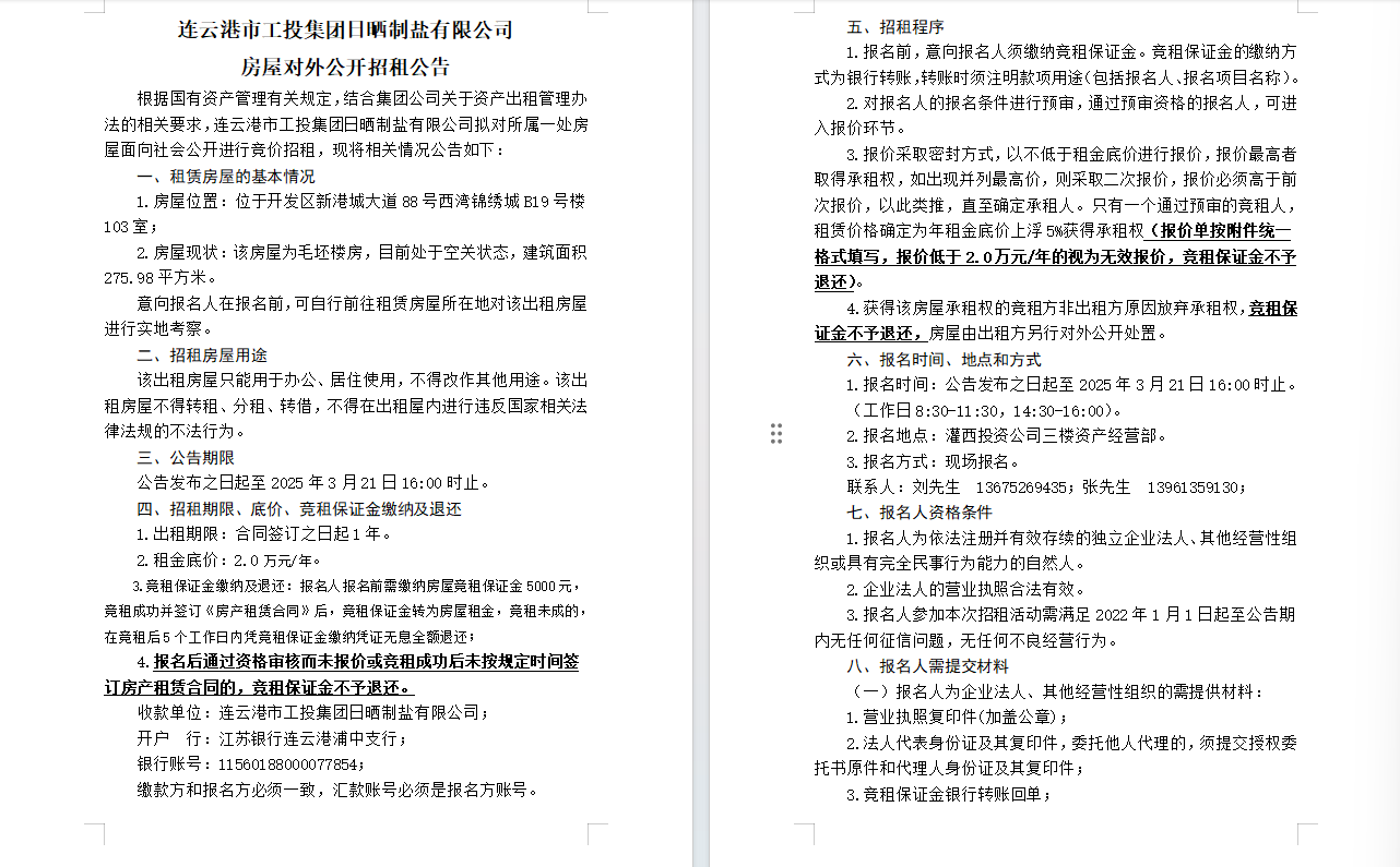 连云港市工投B体育(中国)日晒制盐有限公司房屋对外公开招租公告