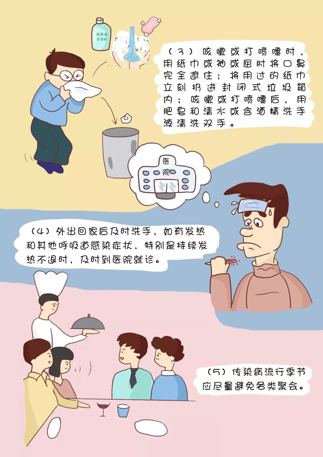 (4)外出回家后及时洗手,如有发热和其他呼吸道感染症状,特别是持续发热不退时,及时到医院就诊。