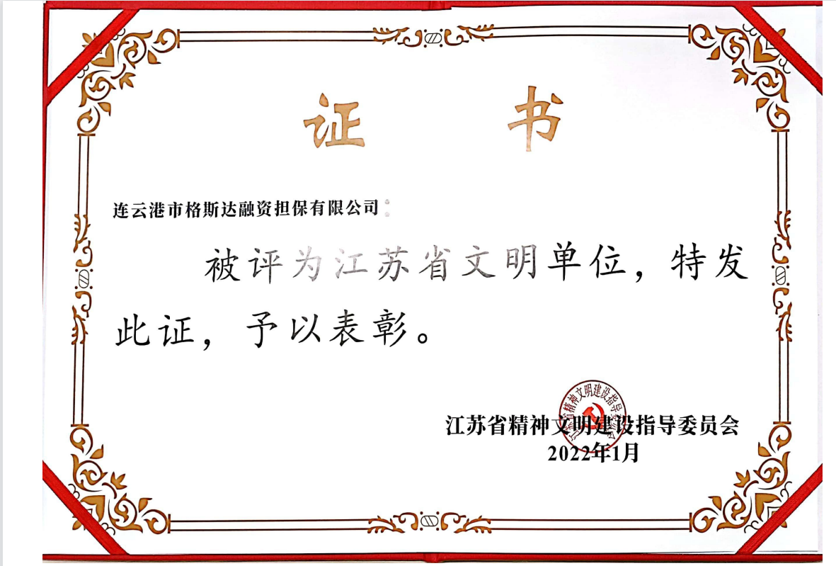 1月,格斯达担保公司被省精神文明建设指导委员会评为“江苏省文明单位”称号。