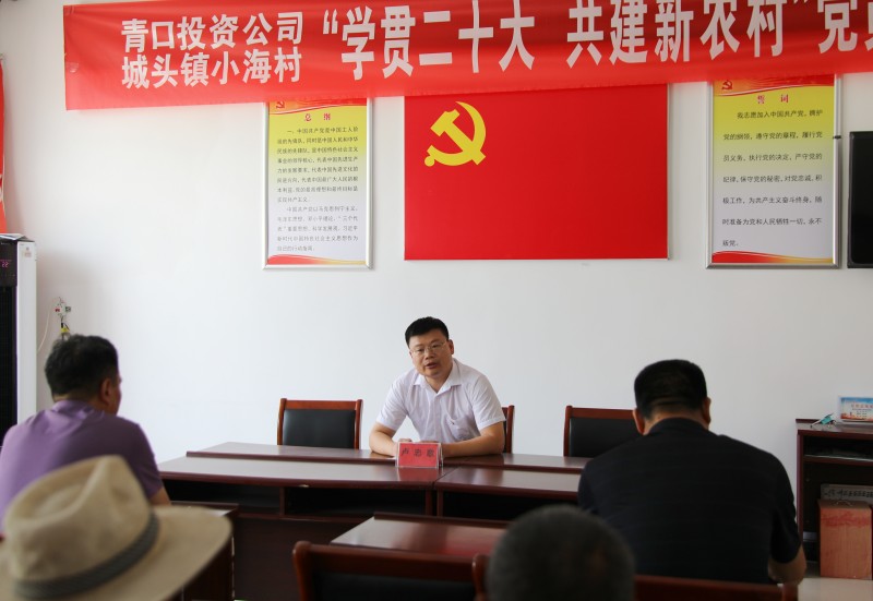 为推动党的二十大精神在乡村落地生根,6月28日上午,青口投资公司、城头镇小海村联合开展“学贯二十大 共建新农村”党员课堂,由公司机关优秀党务干部组成的二十大精神宣讲队,走进结对共建的赣榆区城头镇小海村开展集中式、通俗化宣讲。公司党委副书记、工会主席梁永,城头镇副镇长王延光,城头镇小海村支部书记徐坤参加活动。