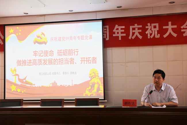 为了庆祝中国共产党建党99周年,继承和发扬党的光荣传统,彰显基层党组织的战斗堡垒作用和党员先锋模范作用,6月28日上午,青口投资公司隆重召开纪念建党99周年庆祝大会暨“七一”表彰大会。会议由党委副书记、工会主席梁永主持,全体领导班子成员、各单位党政负责人、优秀党员代表、机关全体管理人员参加会议。