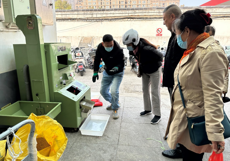 近日,米业营销中心工作人员在巨龙路菜市场进行今年新米的现场脱壳,吸引了许多市民的关注与购买,进一步提高了盐田玉品牌的知名度。同时,为盐田玉线上线下的“双11”优惠活动起到了很好的宣传作用。(耿丽园)