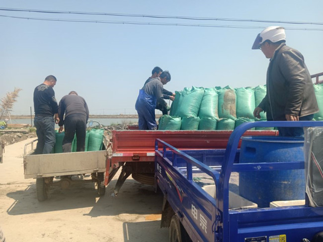 随着气温日渐升高,三洋分场境内养殖户们纷纷忙碌起来,部分完成了梭子蟹、东方对虾苗种投放工作的养殖户池塘,开始投喂鲜活的海沙饵料。据了解,今年海沙单价约2元/每斤,较去年同期偏高。(刘洪文)