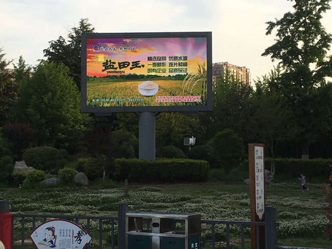 近日,米业营销中心为了做好盐田玉大米的品牌宣传,在苍梧绿园电子屏投放宣传图片。(刘杨)