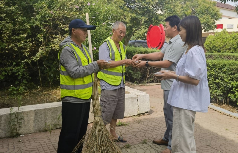 烈日炎炎,有这样一群人在骄阳下依然坚守在自己的工作岗位上,他们就是黄沙坨美容师——环卫工人。为了给高温下辛苦工作的环卫工人送去一份清凉,让他们能够以良好的状态投入到保洁工作中,近日,生产生活服务中心分会将熬制好的绿豆汤分装在碗内,送给正在作业的环卫工人。同时,为他们科普防暑降温知识,叮嘱他们提高安全健康意识,合理调整工作时间。