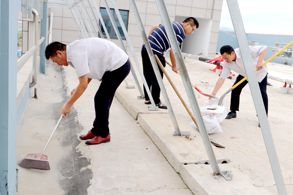 为净化、美化公司办公楼楼顶环境,消除积水隐患,8月26日上午,公司组织党员、团员青年志愿者开展了专项清理整治行动。志愿者不畏艰辛,对楼顶进行了细致清扫,认真疏通排水口,力争阴雨天气不再出现积水现象。(神特宣)