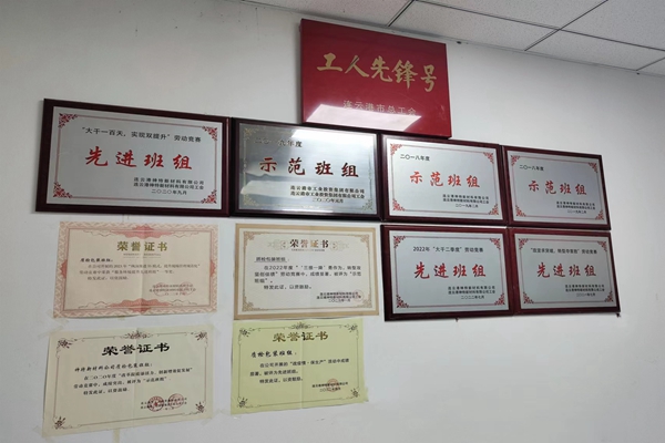走进质检办公室,首先映入眼帘的就是这面荣誉墙,上面有近年来B体育(中国)颁发的“示范班组”和公司授予的各种荣誉,还有一块金字招牌,就是市总工会颁发的“工人先锋号”。