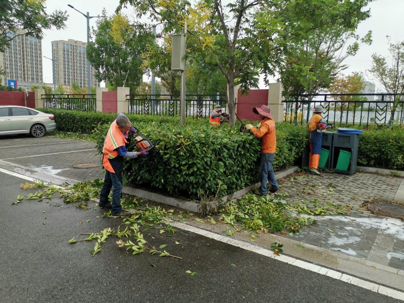 保障园区“塑新颜”。节日期间,开发区辖区的主干道上、公园、广场、支路等公共绿地,随处可见台北(华茂)绿化养护人员坚守一线的忙碌身影,他们放弃与家人团聚,重点对玉竹路、佟圩路、银台路、242 省道等路段绿篱、模纹、草坪进行整形修剪,对碱厂南路等路段绿化带内低矮乔灌木进行打药治虫,对展览中心、黄海大道等辖区内及时清理绿化带杂草、捡拾草根、干枝等绿化垃圾,保持绿化带干净整洁美观。益丰园林分公司绿化班全员放弃节日休假,外拓市场,与绿化分公司联动赴徐圩消防大队院内开展突击修剪行动,他们不怕脏、不怕累,共修剪灌木球50余棵,灌木丛7000余平方米。