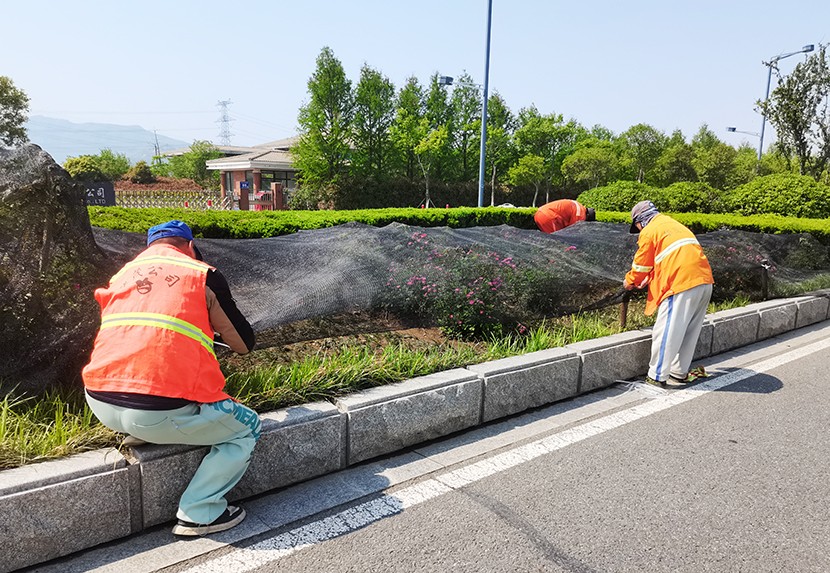 五一期间现场一片繁忙景象。养护工人们采取错峰作业,避开交通高峰,手持高压水枪 ,对辖区东方大道、汇晶路、顾圩路两侧新栽植的苗木进行精准浇灌,确保新栽苗木存活率;东方大道养护班在孙班长的带领下,对东方大道中央隔离带内进行补植麦冬,采取覆盖遮阳网等措施,以减少水分蒸发和避免阳光灼伤。同时充分利用雨后土壤松软,组织工人对辖区绿化带内的杂草、杂树进行清除。