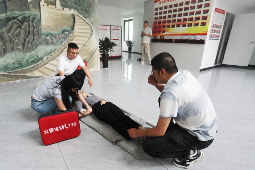 培训中,连云港德安消防职业培训学校资深教员王彦结合多年的工作经验和实际案例,细致地向大家开展了消防理论培训,结合室内外的消防设施的作用,系统讲解了整个建筑消防系统的工作流程,介绍了应急疏散逃生的正确方法步骤;现场教学了消防护具穿戴、自救呼吸器使用;演示了简易担架制作、简易包扎;着重示范了心肺复苏以及海姆立克急救等。通过生动形象地讲解,全体员工对消防安全知识有了更全面、更深入地了解。