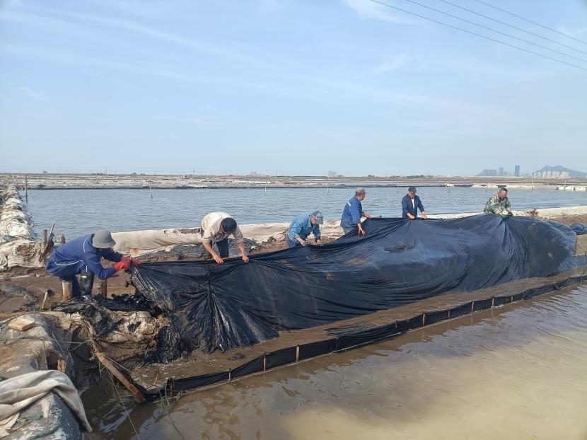 为了尽快完成海滨钙液储备池改造,5月3日,矿盐班组、钙液班组人员全员集聚到海滨钙液滩,把旧塑布进行回收安置,同时对钙液输送管道进行细致的检查,发现需要维修的接口及时维修,确保钙液储备池能够顺利完成改造。此次海滨钙液池的改造可以存储1.5万方,同时也可以尽快退出钙液生产用地,进行改造养殖池塘,为公司增加收入。
