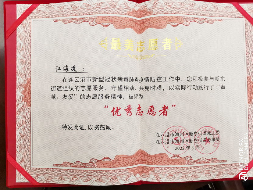 新东街道党工委、新东街道办事处联合为荣誉获得者颁发纪念证书,同时予以表扬,新东街道提到:市工投B体育(中国)台北投资公司党员江海凌同志最肯吃苦,最能战斗。他每天早上到的比谁都早,晚上回的比谁都晚,与社区工作人员一道进楼入户排查信息,仔细询问居民生活物品需求情况并予以解决,还认真参与卡点防控值守、小区巡逻、做好小区出入人员体温检测、登记消杀出入车辆等一线工作。在疫情最后阶段,大部分志愿者撤离,江海凌仍在“逆行”,成为小区居民物资保障志愿者,每天为广大居民“菜篮子”保驾护航,江海凌是勇于担当的逆行者,是最美志愿者。