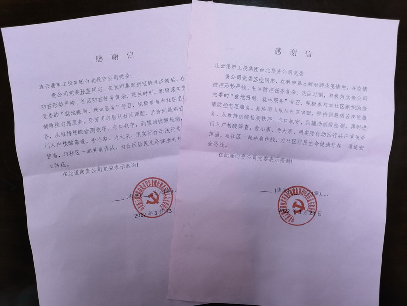 “台北投资公司的党员同志们视疫情防控为己任,服从调度安排,站好每一班岗,不仅认真履行防控职责,又创新开展疫情防控教育宣传、便民服务等多项活动,成为B体育手机官方网站入口社区防疫攻坚的主力军。”3月25日,收到开发区猴嘴街道昌圩社区送来的一份特殊的“礼物”— 一封疫情防控感谢信,感谢台北投资公司党员苏玲、孙芳等同志在新冠肺炎疫情防控的关键阶段挺身而出、伸出援手,参与协助社区的疫情防控工作。