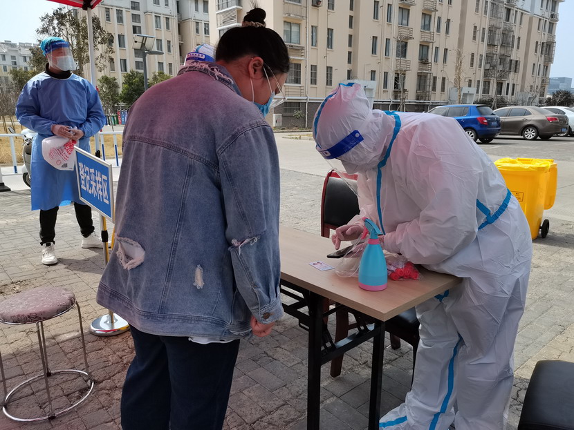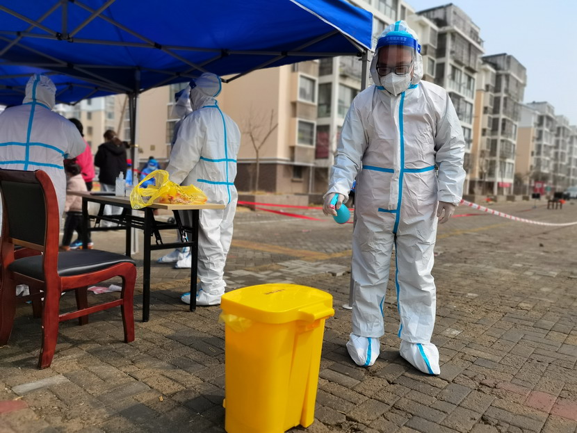 清晨6点30分,1号检测点,李明同志在检查物资,“大白”服装4套、“小蓝”服装6套、棉签600根……;2号检测点,于洪亮在将物资上桌,病毒核酸检测试管、棉签、消毒液,“还缺少一瓶酒精,我立即反馈给社区,请社区抓紧安排送来”;4号检测点,苏玲、秦黎明正在互相帮忙穿好防护服,“秦姐,这个防护面罩里外有两层薄膜,我给你撕掉,这样就不会有雾气了”,“嗯嗯,你这个拉链得拉到顶,B体育手机官方网站入口自己也一定要做好防护”秦黎明温柔的说;5号检测点,内退党员孙芳和姜海洋,互相在防护服后背写上对方的名字,以便于更高效的完成检测工作;6号检测点,霍正钢、朱文健、韩永刚、邱荣滨正在清点检测小卡片;7号检测点,张强在拿着酒精给废物处置垃圾箱消毒;8号检测点,新加入的孙银、占恒春、尹永明、韩永光、赵绍庆正在给消杀喷雾剂灌装84消毒液,社区8个检测点的消杀工作全部由昌圩临时党支部志愿者负责。