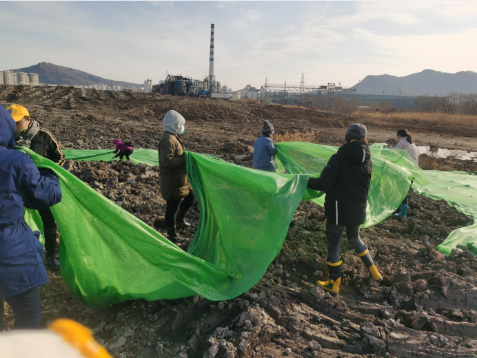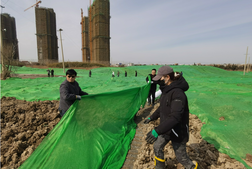 寒冷丝毫没有降低大家的热情,路面因为每天喷洒防尘导致潮湿泥泞,大家穿上雨靴,爬上爬下,一鼓作气,经过两天齐心协力的辛勤劳作,防尘网终于覆盖完毕。远远望去,覆盖绿网后的区域如同覆盖了一片绿色植被。此次绿网覆盖行动,不仅抑制了二次扬尘污染环境,保护了生态环境,同时达到了环境美化的效果。