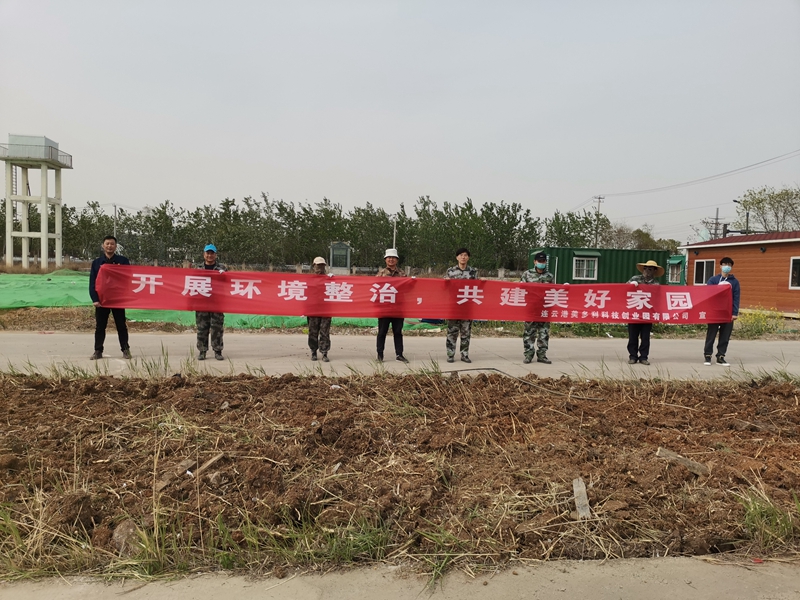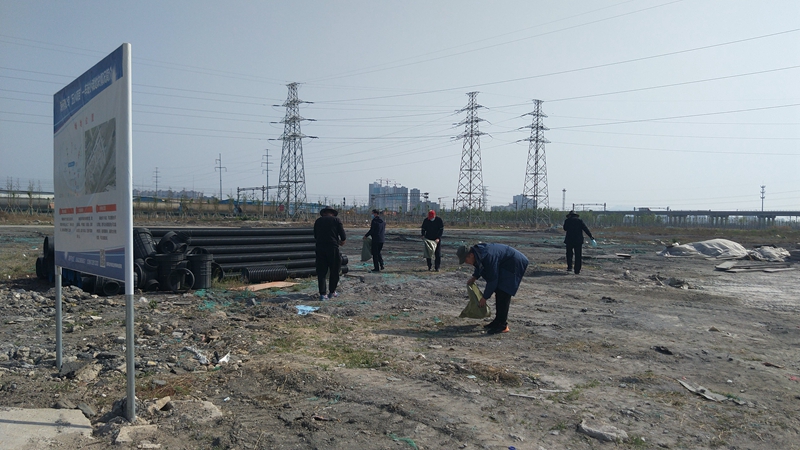翔立分公司党支部携手海州湾公司党支部对公司的车站小滩进行环境整治,为裸露在外的土地进行防尘网铺设。