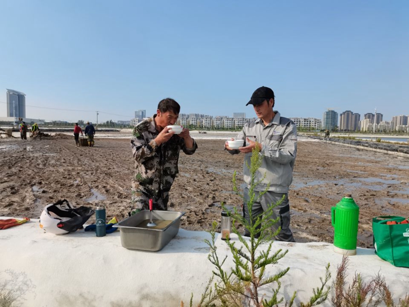 在高温、高湿、高盐的盐田里,盐工们需要补充大量的水分以维持体力。为保障职工安全作业,提高扒盐效率,鼓舞工作干劲,海州湾工会深入滩头采取多种措施做好后勤服务工作。一是由跟班人员24小时提供热水、绿豆汤,确保职工体力充沛;二是为职工解决“一日三餐”问题,安排专人负责“三班制”饮食,注重营养配比,确保职工全身心投入生产;三是配备安全反光马甲,确保职工大小夜班交通安全。