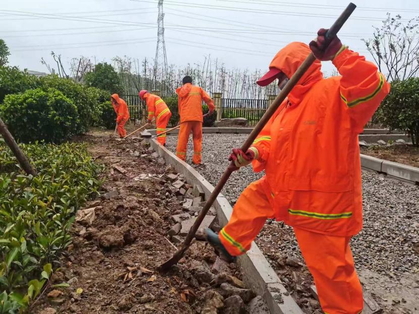绿化工人无暇顾及这倾盆大雨,他们头戴草帽,身披雨衣,手中的工具一刻也未曾停歇。他们或是弯腰修剪着路边疯长的枝叶,或是蹲在地上清理着被雨水冲刷堆积的杂草。雨水顺着他们的脸颊流下,模糊了他们的视线,但他们只是抬手随意抹一把,便又继续投入到工作中。那一双双粗糙的手,在风雨中熟练地操作着工具,仿佛在与大自然进行一场无声的较量。