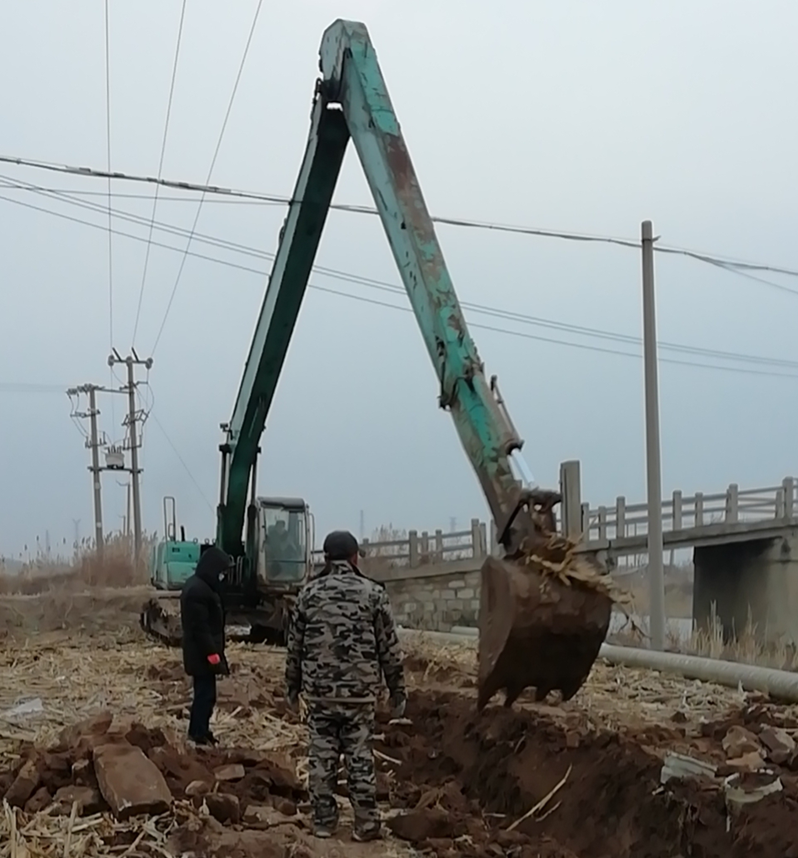 难!难!难!有困难才具有挑战,在“四拼”前一切困难皆为“纸老虎”,大家及时将压力变为动力。确定方案后,立即分头行动,一切工作按部就班,购买8米木桩,河岸边专人指挥长臂挖掘机机械打桩,头顶高压线与通信线路相互交织,现场安全员全过程监督指挥保障施工安全距离紧张施工,利用简易泡沫筏人工敲开河面冰层,划到河心钻孔安装木横担,人工开挖河对岸管道,切割吊取管道,打磨涂覆,一切都在有条不紊的进行中。考虑到玻璃钢管道的易碎性,不敢使用挖掘机吊装,只能全人工小心翼翼的一小段一小段的轻抬慢放,慢慢挪到门型横担上缓缓过河,捆绑固定,最后是对口缠裹涂覆回填竣工。