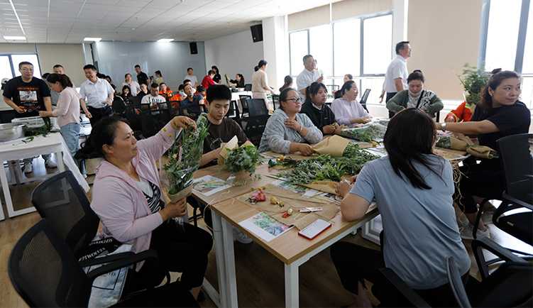 端午粽叶香,艾草忆传统。悦升活动现场,随着主持人一声令下,大家各尽所能投入到艾草DIY,疯狂的粽子,五彩香包迎端午等活动中。捋粽叶、折漏斗、填糯米、放馅料、绑线绳一气呵成,翠绿的粽叶、新鲜的糯米在大家的巧手翻飞中变成一个个棱角分明的粽子。DIY现场选手们依据自己的喜爱和想法巧夺天工,一束束艾草花惊现眼前;一根根鱼竿钓起的不是鱼儿,而是疯狂的粽子……整个活动在欢声笑语中接近尾声。