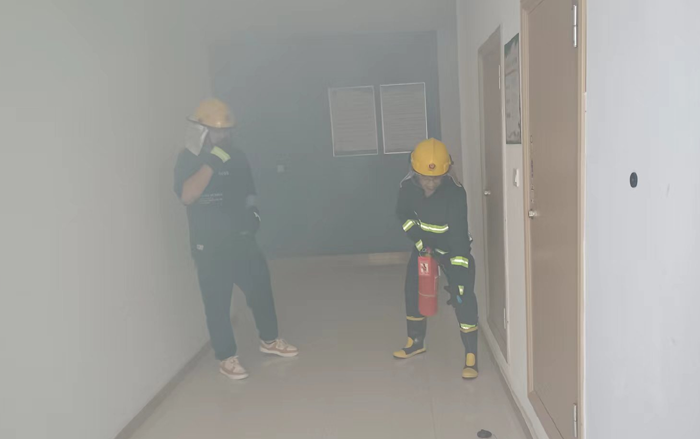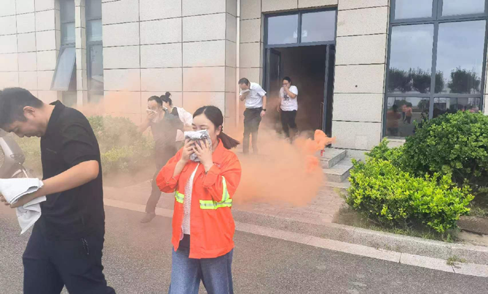 本次演练模拟公司办公楼三楼电缆井因电路故障引发火情组织职工开展应急疏散。 “起火啦!”15时许,办公楼三楼一电缆井内突然涌出滚滚浓烟。临近人员发现着火后,第一时间使用灭火器进行扑救。浓烟触发自动报警装置,消防控制室值班人员接到警报后,立即通知志愿消防队伍赶赴现场扑救,并拨打报警电话,向应急指挥部报告。公司应急指挥部立即启动应急预案,灭火抢救组、安全救护组、紧急疏散组等应急小组随即到位,有条不紊开展灭火、疏散等工作。消防救援队伍到达现场后,接过现场指挥权,开展灭火救援。安全抢救组搜索受伤人员,并对受伤人员简单急救后送往医院进行治疗,紧急疏散组立即组织办公大楼人员,用湿毛巾捂住口鼻从应急通道撤离。10分钟后,险情排除,应急救援结束。最后,组织部分人员开展灭火实操演练